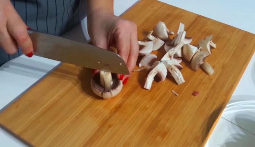 Теперь помоем шампиньоны, нарежем ломтиками. Слегка обжарим на сковороде с растительным маслом.