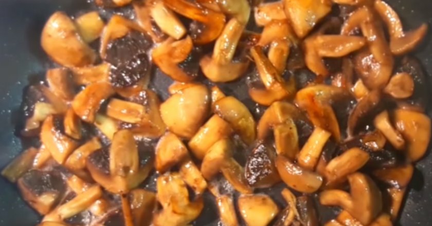 На той же сковороде слегка обжарить грибы и отложить в сторону.