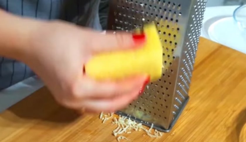 Воспользовавшись крупной теркой, натираем твердый сыр прямо на разделочной доске. В конце пересыпаем стружку в свободную тарелку и переходим к приготовлению самого блюда.
