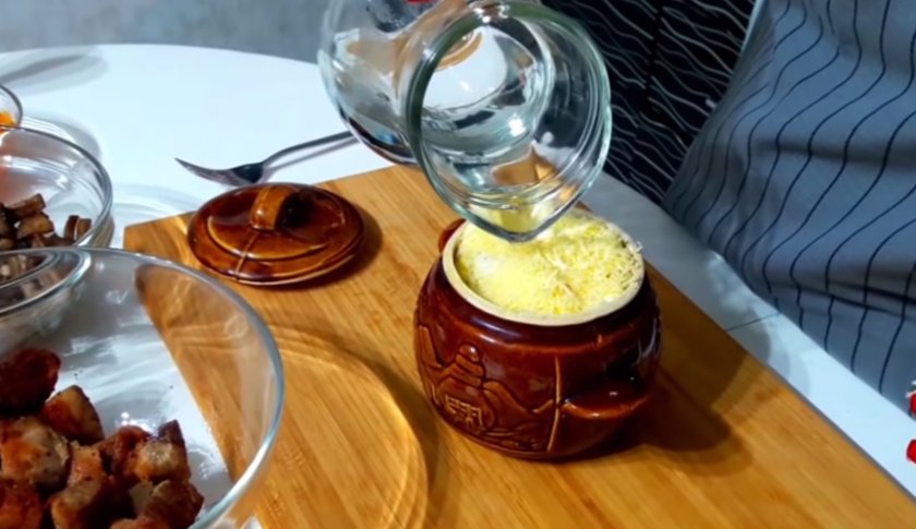 - Натереть на крупной терке сыр и посыпать им блюдо в горшочках