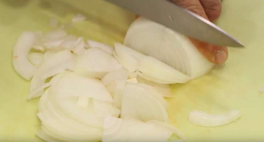 Репчатый лук нарежем полукольцами, если луковицы небольшие. Большой лук сначала разрежем на четвертинки, а затем нашинкуем, выложить к грибам. Посолим, перемешаем, обжарим в течение 3–5 минут.