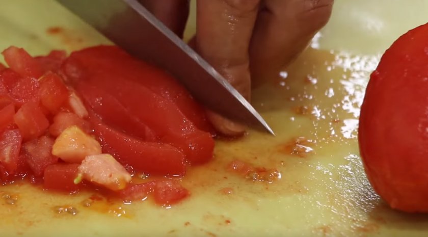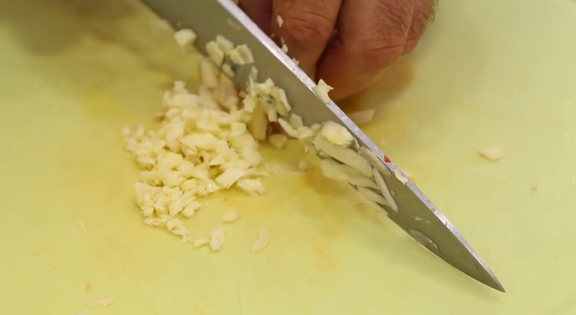 Отряхнув от лишней жидкости, выкладываем компонент обратно на ровную поверхность и теперь мелко рубим подручным инвентарем. Измельченный чеснок пересыпаем в чистое блюдце.