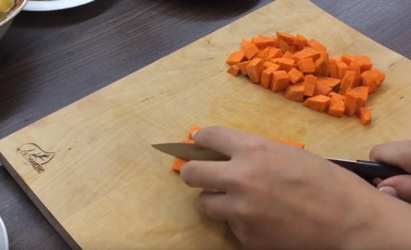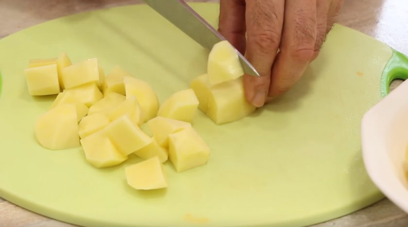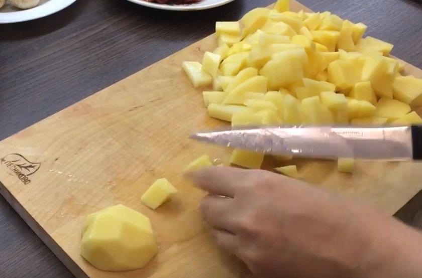 Картофель у нас уже подготовлен, мы его нарежем крупными кубиками. Но не слишком. Ведь нам нужно чтобы было и вкусно, и пропечено.