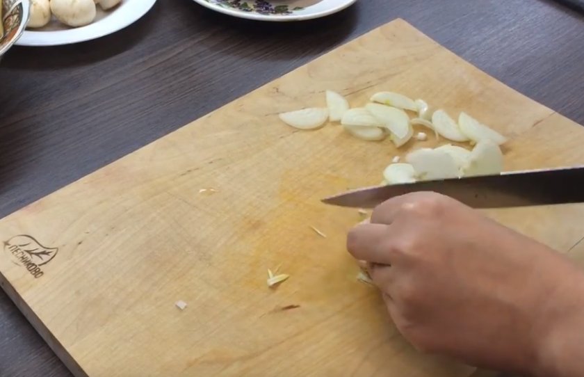Если готовите с белыми грибами, или рыжиками, просто крупно их нарежьте.