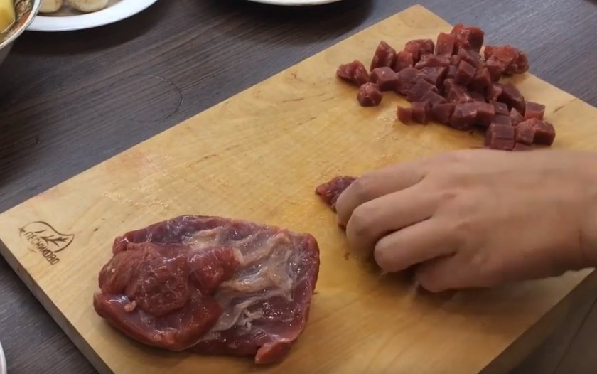 Мясо вымыть, обсушить и нарезать крупными кубиками.