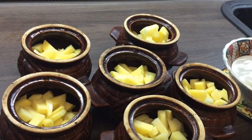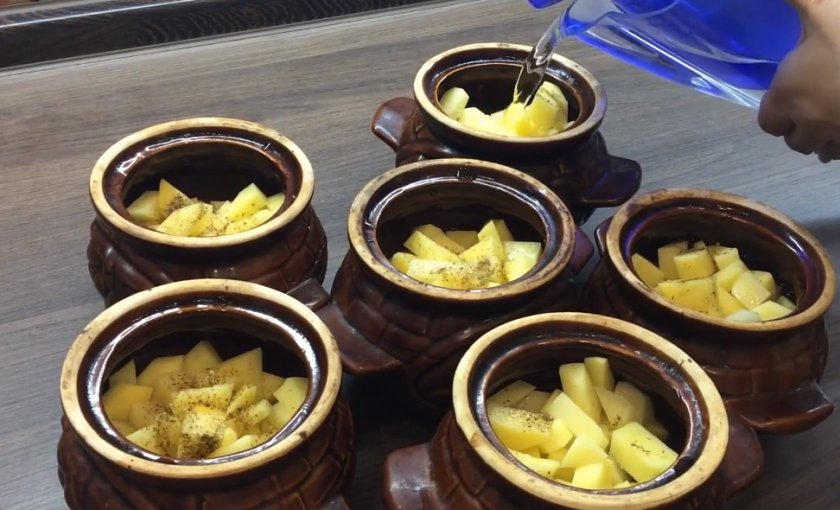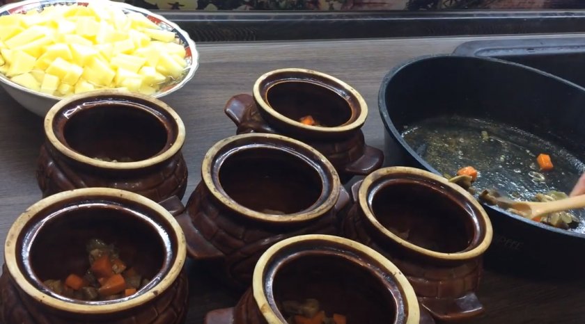 Не стоит сильно обжаривать картофель на сковороде, чтобы в горшочке при тушении не образовалась каша. Если блюдо в горшочки выкладывается послойно, то картофель следует положить первым слоем, чтобы он пропитался ароматами остальных ингредиентов.