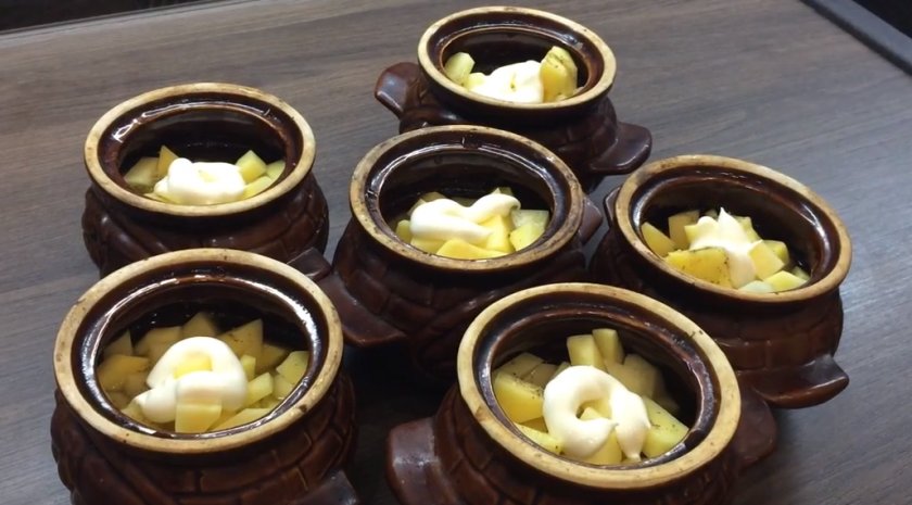 В каждый горшочек положить по 2 ст. л. сметаны (или майонеза), влить немного воды (около 30 мл).