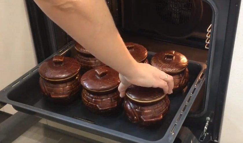 - Если у вас обычный духовой шкаф, то духовку следует немного прогреть (10 минут) перед тем как поставить горшочки. Так, вы прогреете верх духовки, а ваши горшочки запекутся равномерно и сверху и снизу.