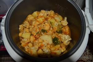 Через указанное время в чашу мультиварки отправляем картофель, соль, прованские травы, а также воду. Количество воды зависит от того, какую консистенцию картофеля вы в результате хотите получить. Закрываем крышку мультиварки и готовим блюдо на режиме «Тушение овощей» примерно один час. Продолжительность приготовления в значительной степени зависит от сорта картофеля и от того, насколько быстро он разваривается. Поэтому вы самостоятельно контролируйте этот процесс.