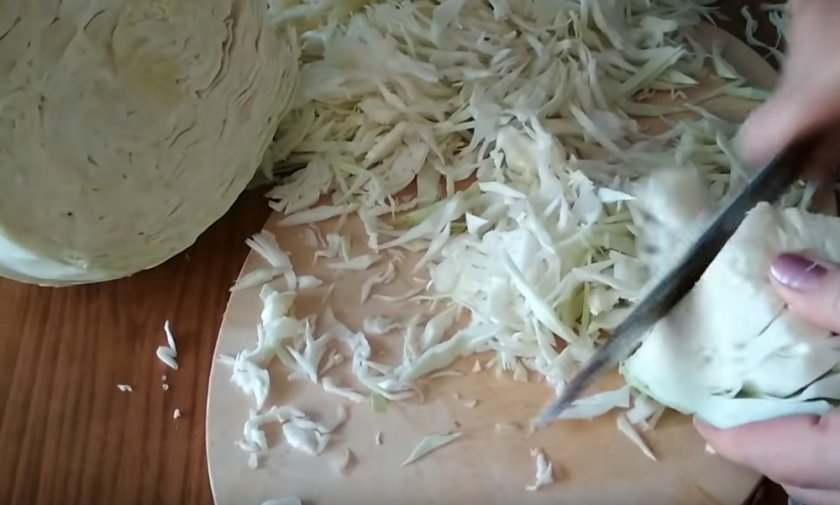 - Сняв с кочана верхние листочки, его шинкуют достаточно крупно.