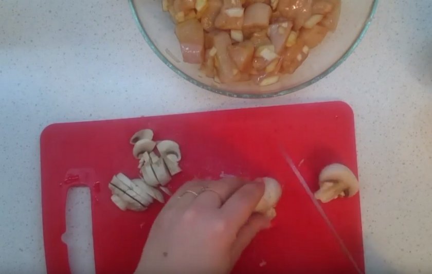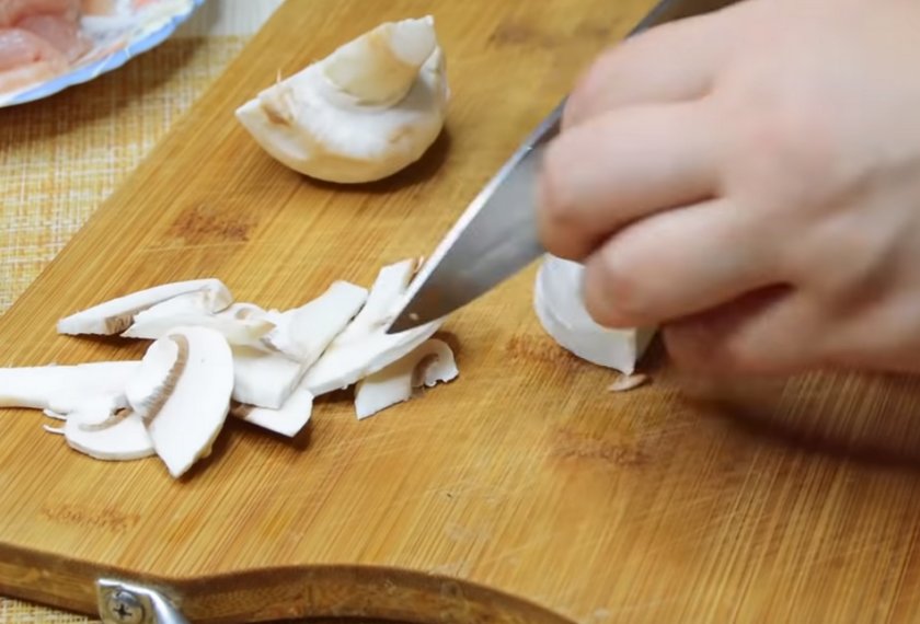 Подготовка ингредиентов заключается в том, что сначала нужно их промыть под чистой проточной водой. Это позволит смыть все загрязнения, пыль или наличие других ароматов (такие случаи оправданы тем, что на прилавках продукты лежат рядом с другими товарами). После промывания очистите шампиньоны от кожуры и обрежьте нижнюю часть ножки, где скапливается больше всего грязи. С курицы удалите плёнку, которая есть на поверхности. Если этого не сделать, то филе будет плохо нарезаться.