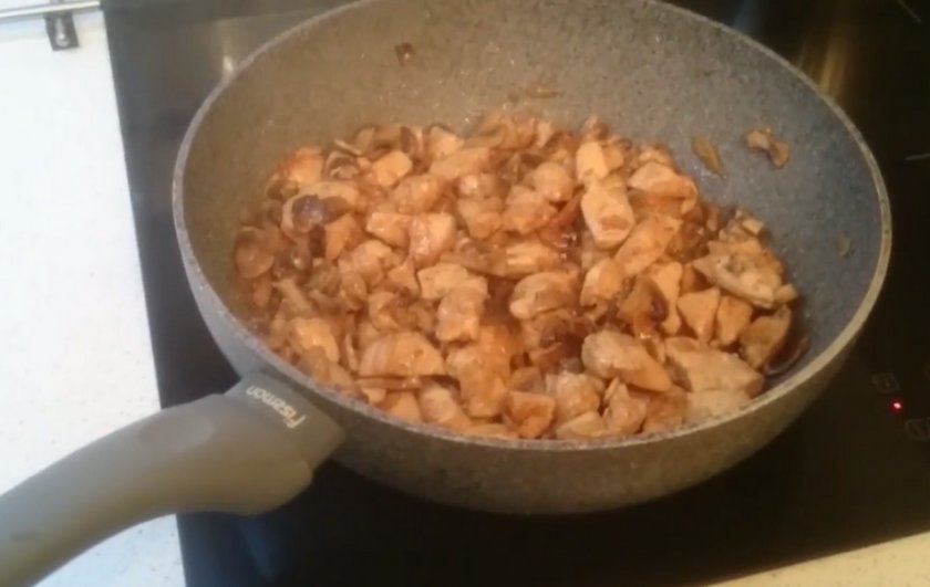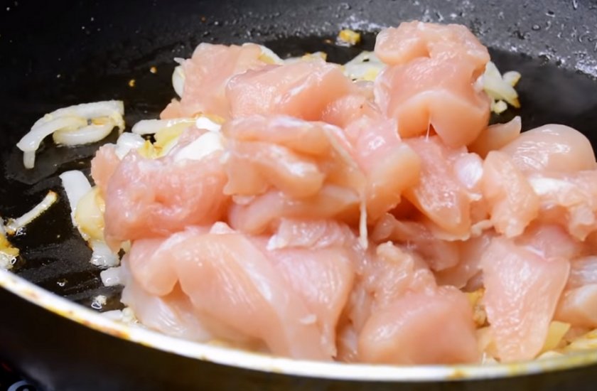Добавьте к луку мясо и готовьте, пока грудка не побелеет.