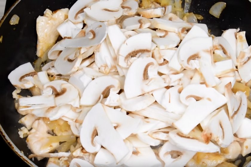 Выложите на разогретую сковороду с маслом лук. Через 5–7 минут добавьте грибы и тушите ещё 10 минут. Всыпьте измельчённую курицу.