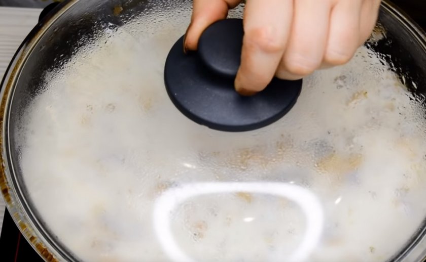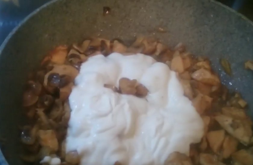 Когда влага из грибов полностью испарится, добавьте сметану и воду.