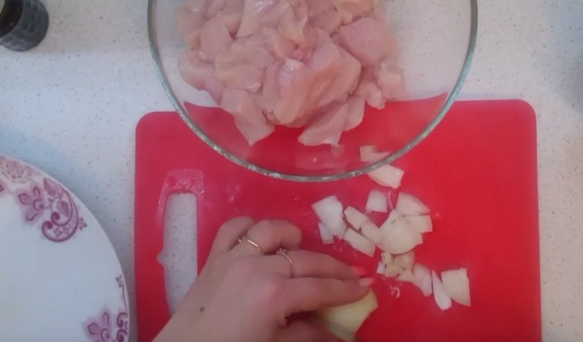 Измельчите кубиками грибы и лук. По истечении 3-4 часов нарежьте грудку соломкой или по своему усмотрению.