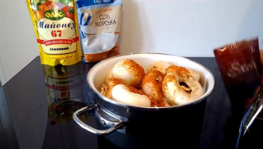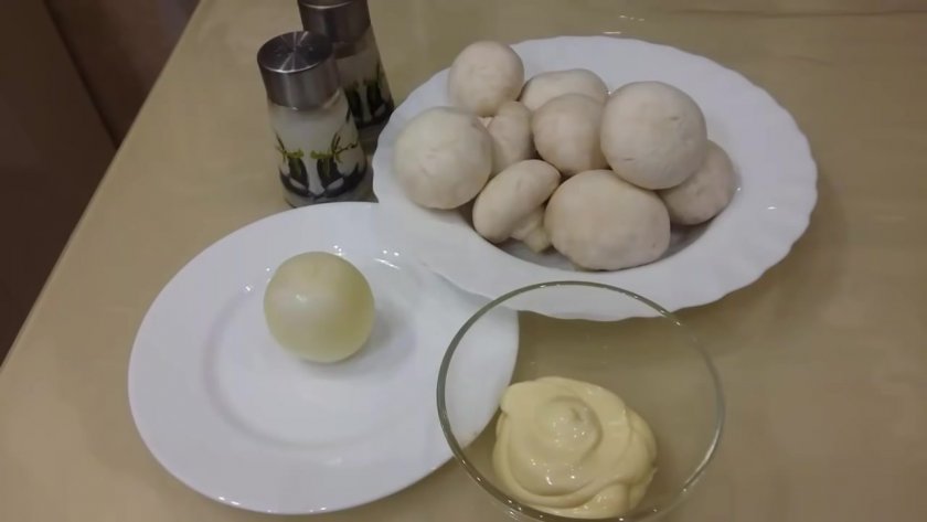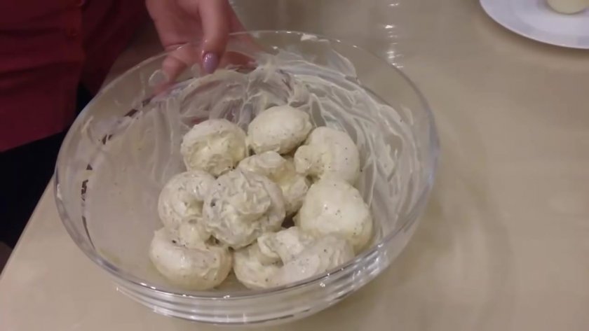 Помойте, очистите и обсушите целые грибы, почистите лук. Добавьте к грибам майонез, посолите и поперчите ингредиенты, хорошо всё перемешивая.