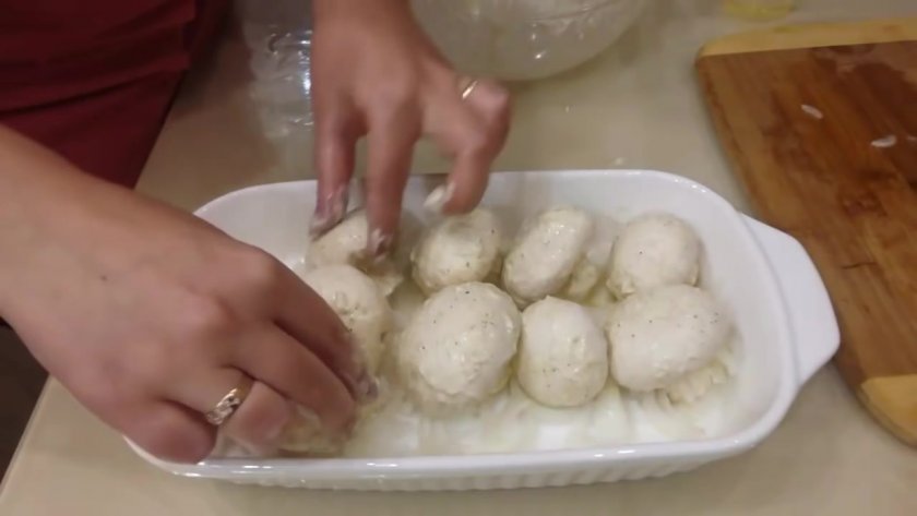 - Шляпки грибов плотно уложить в форму для запекания, смазав ее маслом.