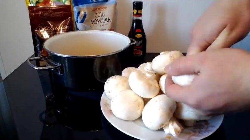Сложите шампиньоны в кастрюлю и замаринуйте, смешав с соевым соусом, куриной приправой, небольшим количеством соли и 1 ст. л. майонеза (перемешивать ингредиенты лучше руками, смазывая каждый гриб). Замаринованные шампиньоны оставьте пропитаться на 2-3 часа.
