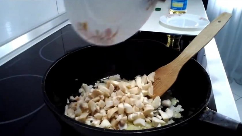 - В это время все, что осталось от грибов, нарезать и обжарить на сковородке около 10 минут.