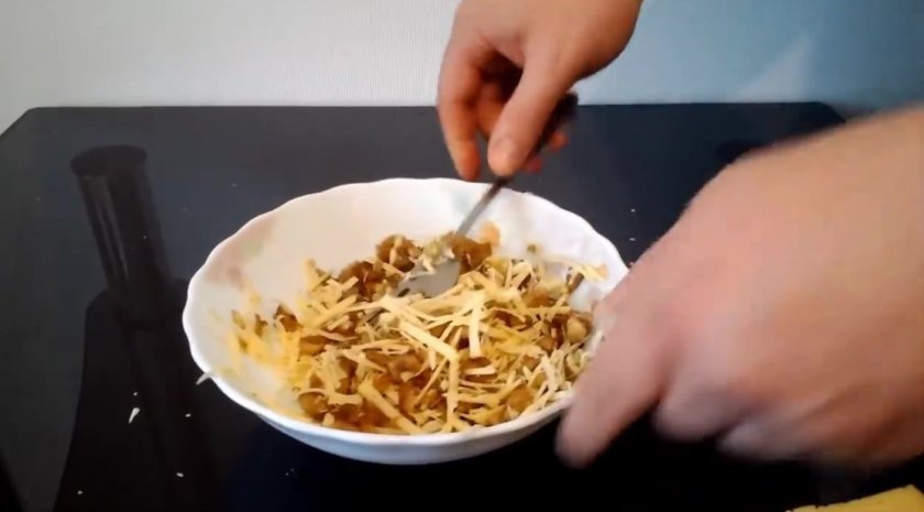 – Можно смешать сыр с обжаренными грибными ножками и репчатый луком.