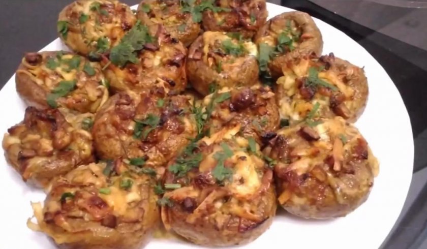Шампиньоны целиком в духовке с чесноком, сыром, говядиной и картошкой