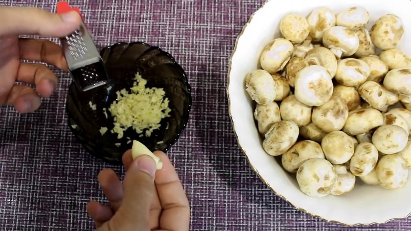 Помойте и обсушите шампиньоны. Очистите и натрите на мелкой тёрке чеснок.