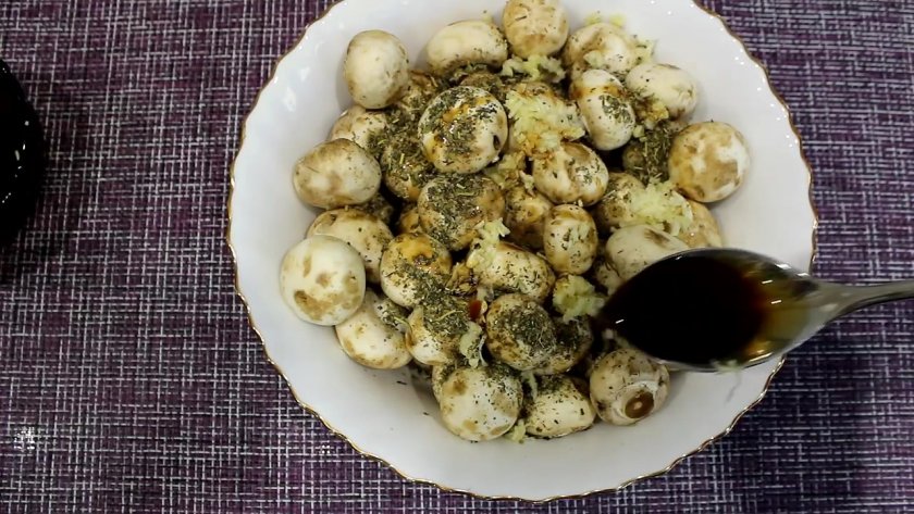 ![]() Присыпьте грибы прованскими травами, выложите сверху чеснок, вылейте соевый соус, растительное масло (1-2 ст. л.) и майонез, хорошо перемешивая все компоненты. Присыпьте грибы прованскими травами, выложите сверху чеснок, вылейте соевый соус, растительное масло (1-2 ст. л.) и майонез, хорошо перемешивая все компоненты.