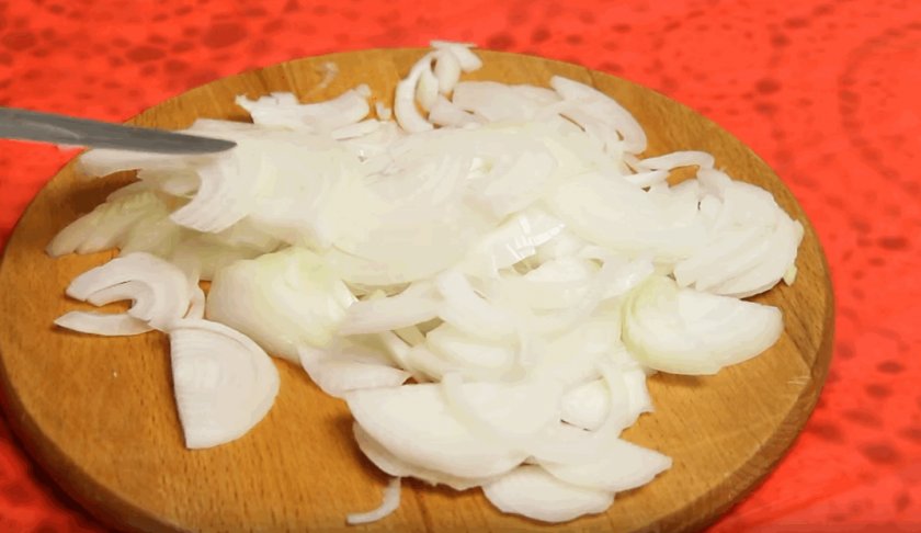 - Снимаем с лука шелуху, промываем, обсушиваем и разрезаем на полукольца.