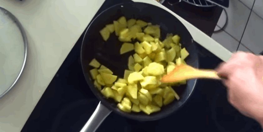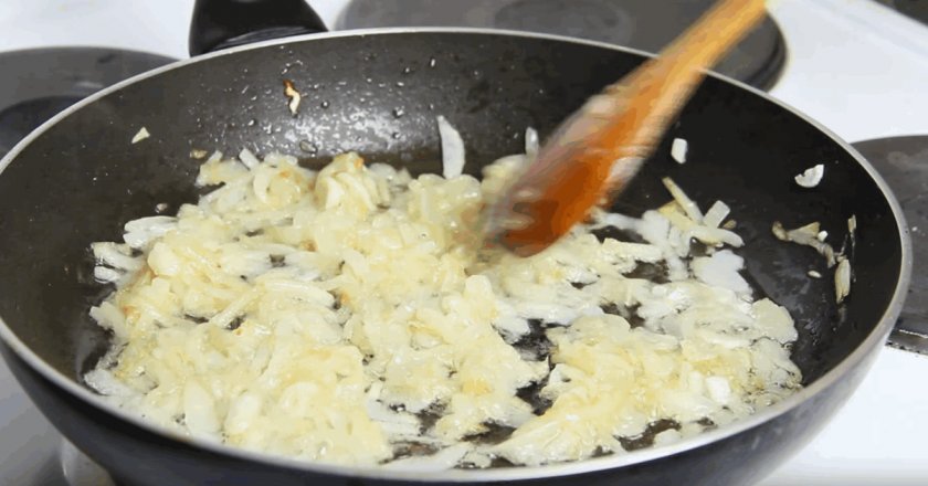 - Разогреваем сковородку с маслом и обжариваем лучок, пока он не станет полупрозрачным.