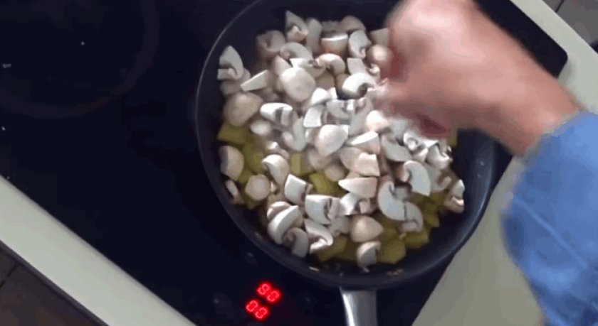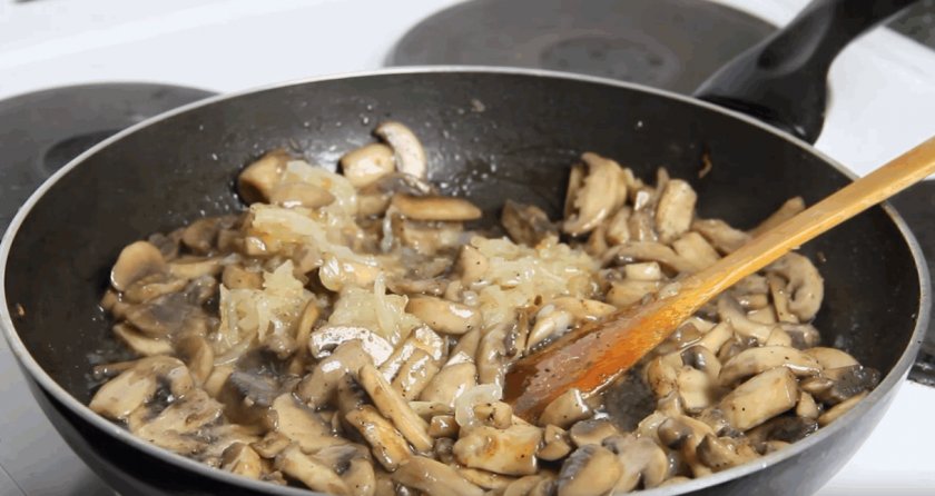 – Можно так же обжарить шампиньоны с небольшим количеством лука. Репчатый добавьте в самом начале, а вот зеленый — в конце приготовления.