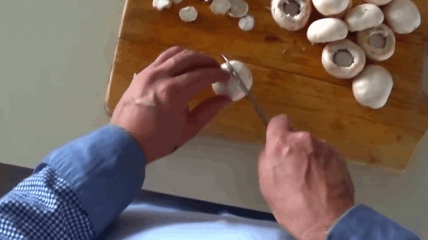 - Грибы очищаем, соскабливаем ножом кожицу с ножек. Промываем в холодной воде. Чтобы шампиньоны не потемнели – в воду добавляем уксус или лимонную кислоту.
