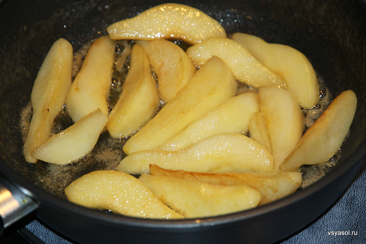 Через несколько минут на сковороду можно выкладывать кусочки груш.