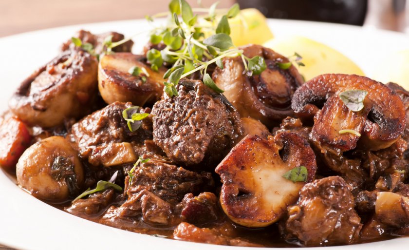 Мясо, тушеное с грибами в сметане, получится восхитительно сочным, нежным и мягким. А густой кремовый соус подойдет к любому рассыпчатому гарниру или к картофельному пюре.