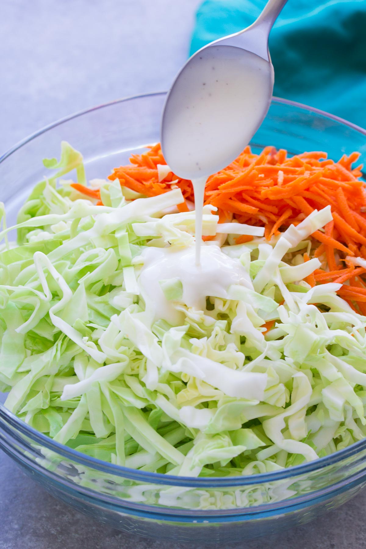 В миску меньшего размера добавьте майонез, яблочный уксус и соль. Перемешать.